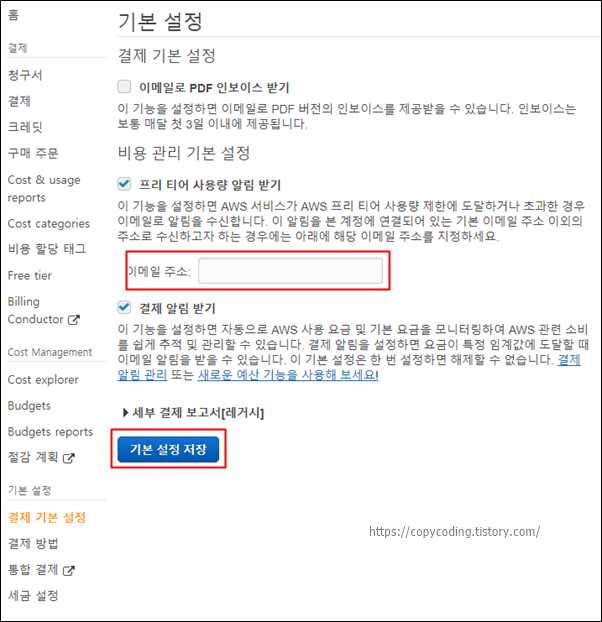 저는 두개만 선택하고 [기본 설정 저장] 클릭했습니다. 화면 캡처를 하기위해 이메일 주소를 입력하지 않았는데 꼭 입력 하세요.