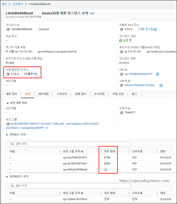 여기서 중요한건 자동 할당된 IP 주소입니다. 이것이 외부에 공개된 Server IP 입니다.