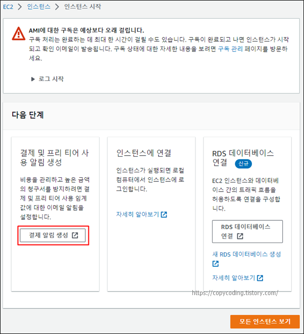 인스턴스를 생성하는 동안 휴식 보다는 [결제 알림 생성]을 설정 합니다.