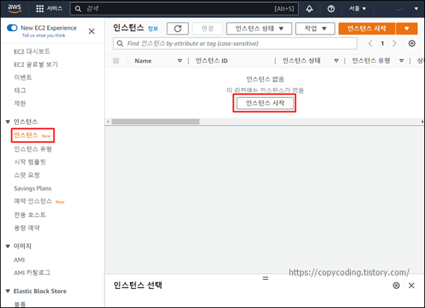 신규 인스턴스를 생성하기 위해 우측에서 [인스턴스 시작] 버튼 클릭합니다.