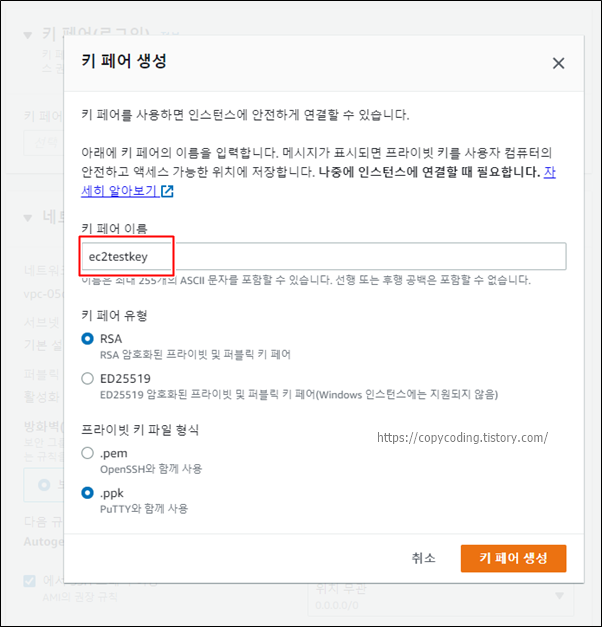 키 페어 이름은 기억하기 편하게 입력 하는데 나중에 생성된 키의 파일명으로 사용됩니다.