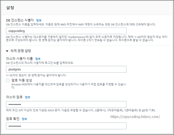 DB 인스턴스 식별자는 고유한 인스턴스명을 만드는것으로 자신이 RDS를 어떤 목적으로 생성하는지 확인할 수 있도록 만들면 됩니다. 실제 사용할 DB Name은 나중에 입력하는 항목이 나오니 혼동하지 않으면 됩니다. 물론 DB명으로 똑같이 입력해도 되겠죠.
