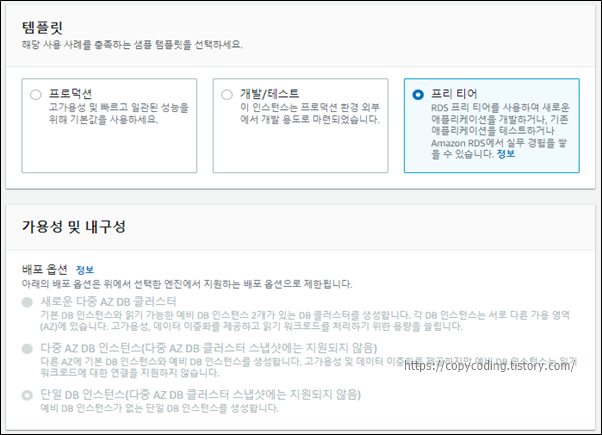 템프릿은 무료로 테스트만 하려는거라서 [프리 티어]를 선택 합니다. 프리티어를 선택하면 하단의 가용성 및 내구성은 비활성화 됩니다.