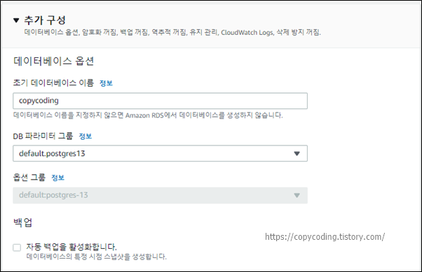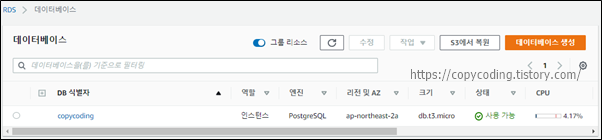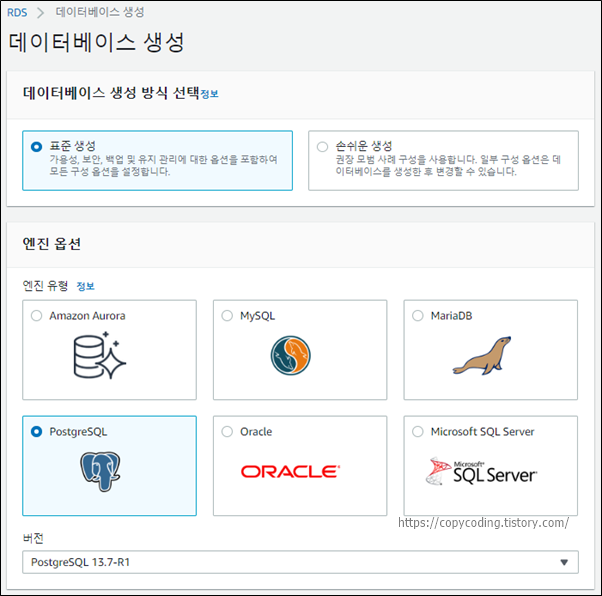 엔진 유형 : 자신이 원하는 Database를 선택해 줍니다. 저는 PostgreSQL를 선택했습니다.