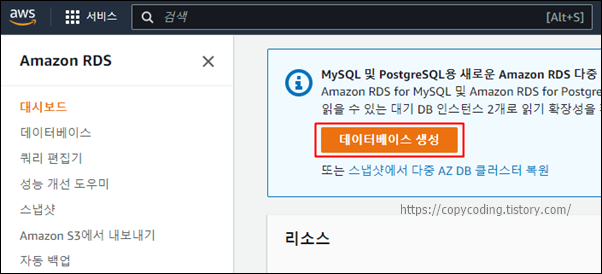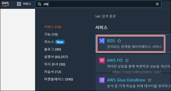 검색창에 rds를 입력하고 우측에 나오는 RDS를 클릭하여 생성 단계 페이지로 이동 합니다.