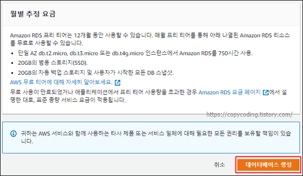 중간에 나오는 값들은 대부분 추가요금을 내야하는 설정이므로 기본으로 두고 [데이터베이스 생성] 버튼을 클릭 합니다.