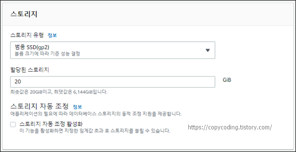 할당된 스토리지가 기본값으로 200이 되어있는데 무료가 20GB이라고 했으니 낮추고 스토리지 자동조정 활성화도 체크 되어있는데 체크를 해제 해야 합니다. 사용중 데이터 용량이 모자라면 자동으로 확장하는건데 확장하는 만큼 과금 됩니다.