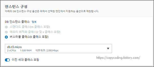 DB Server의 사양을 선택하는 것으로 RDS 설명 페이지에서 무료 인스턴스는 db.t2.micro 로 되어 있는데 db.t3.micro가 선택되어 있습니다.