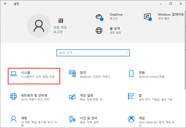 설정 팝업 창에서 [시스템]을 클릭 하고
