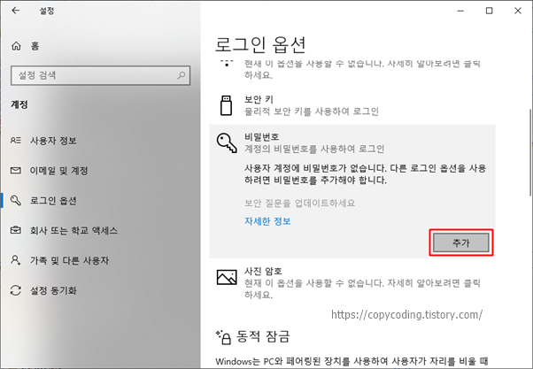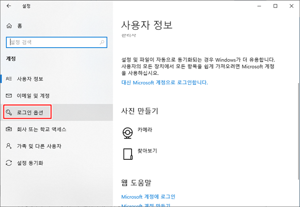 좌측 메뉴에서 [로그인 옵션]을 선택하고