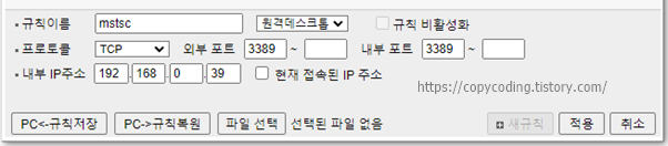 여기서는 원격접속연결이니 Port 3389를 내 컴퓨터의 IP에 연결해 주면 됩니다.
