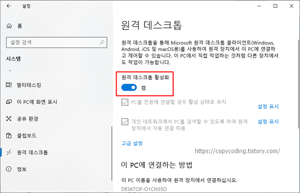 우측에서 [원격 데스크톱 활성화]를 찾아 켬으로 선택 합니다.