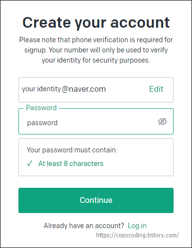 이메일과 비밀번호 8자리 이상을 입력하고 [Continue] 버튼을 클릭합니다
