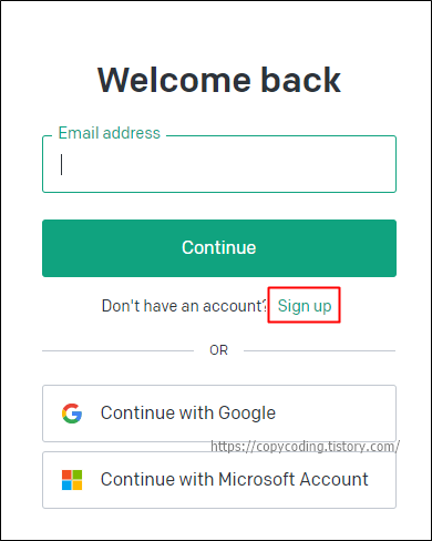 회원가입인데 실수하여 Log in 버튼을 클릭 하였 이 화면으로 왔다면 [Continue] 버튼 아래에 있는 Sign up을 클릭 합니다.