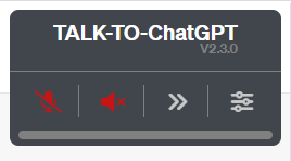 Talk-to-ChatGPT 창에 아이콘이 4개가 보이는데 첫 번째 마이크 모양은 사용자가 말을하면 마이크로 음성을 입력 받는 것이고 두 번째 볼륨 아이콘은 ChatGPT가 사용자의 질문에 스피커를 통해 대답하는 것입니다. 세 번째 빨리 가기 아이콘은 현재 질문에 대한 답변을 충단하고 다음으로 넘어가는 것입니다. 그리고 마지막 네 번째는 환경 설정 아이콘입니다.