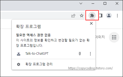 설치가 잘 되었는지 확인하려면 크롬 브라우저 우측 상단에 있는 확장 프로그램 관리 아이콘을 클릭하면 설치 목록을 볼 수 있습니다
