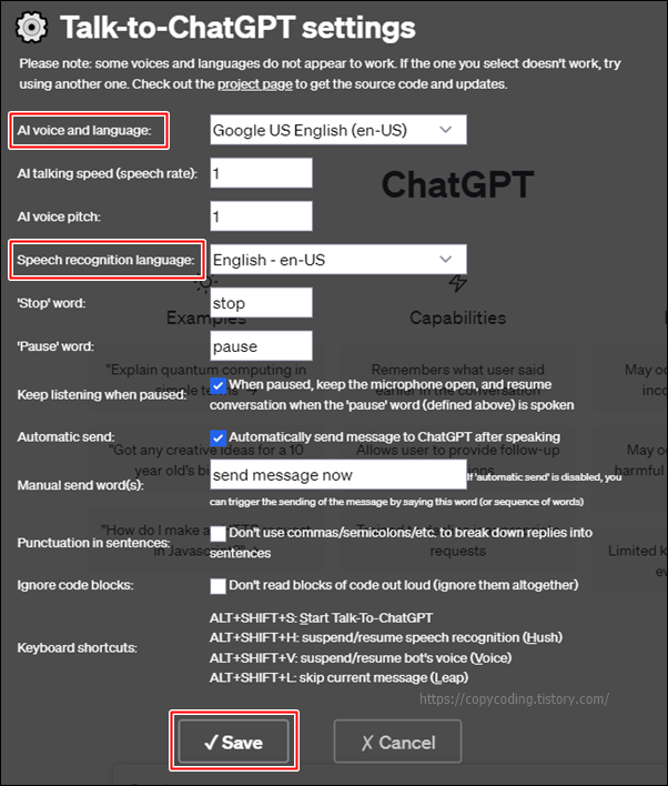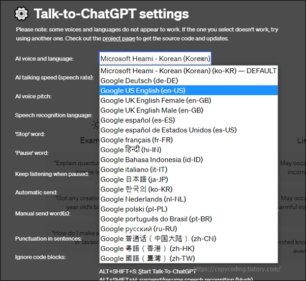 첫 번째 AI voice and language는 ChatGPT가 응답하는 언어 이고 두 번째 Speech recognition language는 사용자가 질문할때 사용하는 언어입니다.