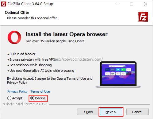 Opera 브라우져를 설치해준다는데 지금 크롬으로 만족하므로 [Decline] 을 선택하고 [Next] 버튼을 클릭 합니다.