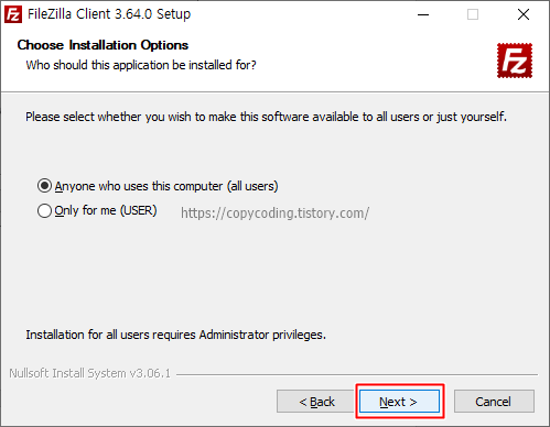개인 컴퓨터라면 별 의미 없지만 아무나 사용가능으로 선택 하고 [Next] 버튼을 클릭 합니다.