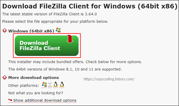 FileZilla Client는 윈도우용 프로그램과 다른 운영체제에서 사용 가능한 프로그램도 있는데 여기서는 윈도우에 설치하는 프로그램을 다운로드 합니다.
