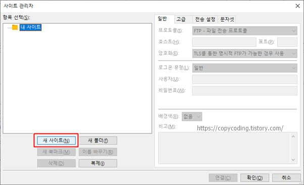 팝업이 나타나면 여기서는 입력이 안되고 왼쪽 하단의 [새 사이트] 버튼을 클릭해서 오른쪽 입력란을 활성화 하여 접속하려는 서버를 추가 합니다.