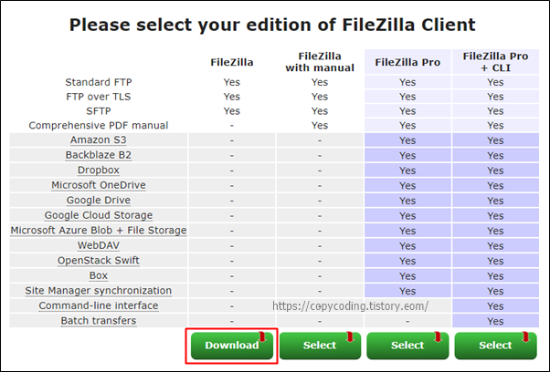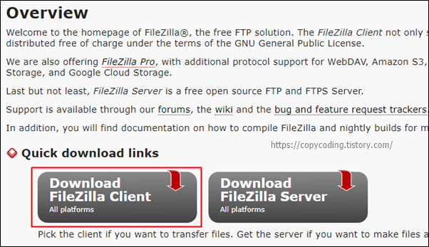 [Download FileZilla Client] 큼지막한 버튼을 클릭 합니다.