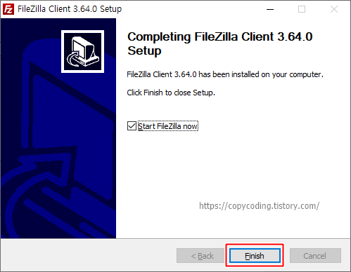 Start Fileilla now가 선택된 채로 [Finish] 버튼을 클릭하여 어떻게 생겼나 구경 합니다.
