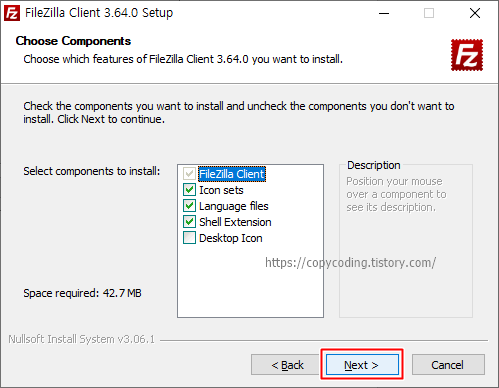 설치할 컴포넌트항목 입니다. [Next] 버튼을 클릭 합니다.