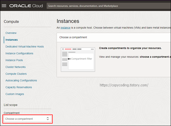 좌측 하단 Compartment에서 root를 선택하여 실행중인 인스턴스를 확인 합니다.