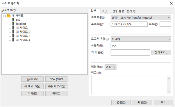 FileZilla와 동일하게 Public IP와 opc 등 접속정보를 입력합니다.