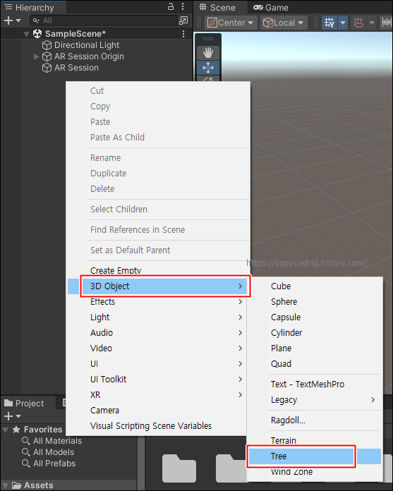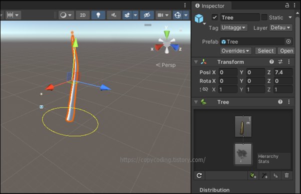 나무를 클릭하고 나무의 위치를 원점에서 조금 이동을 시켰 봅니다. 원점은 내가 서있는 곳으로 나무가 같이 있으면 보이지 않겠죠.