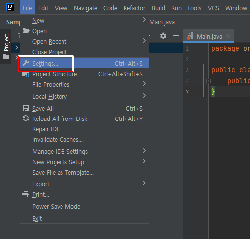 상위 메뉴에서 File > Settings... 메뉴를 선택하여 Settings 팝업을 오픈합니다.