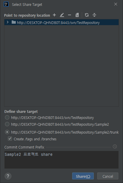 Repository를 선택하고 간단한 Comment를 작성한 후 Sample2 프로젝트를 Share 합니다.