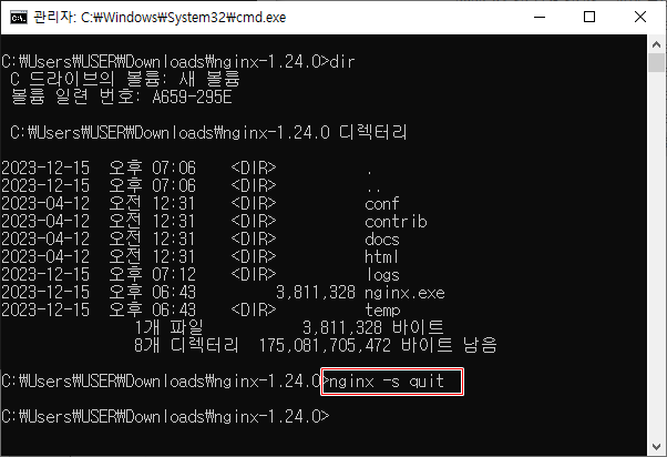 nginx -s quit 명령을 이용하여 종료합니다.