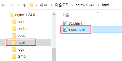 대충 알것 같습니다. nginx.exe 파일을 기준으로 html 폴더와 그 내부에 index.html 파일이 보이는군요.