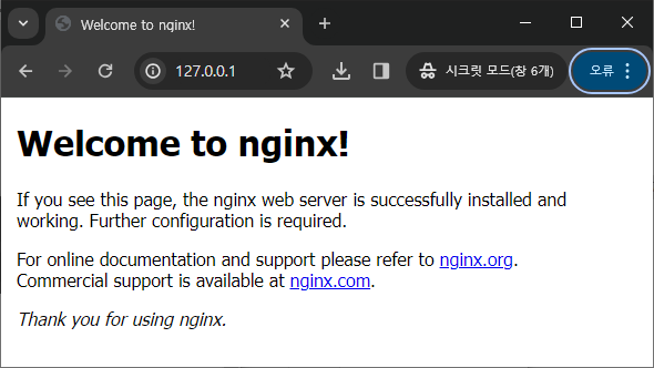 진짜 잘 실행을 하고 있는지 확인을 하기 위해 웹브라우져를 하나 열고 127.0.0.1을 입력해 봅니다.