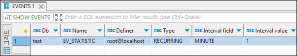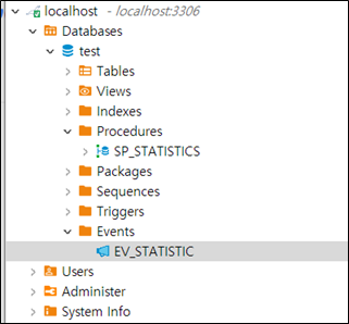 | CREATE EVENT EV_STATISTIC ON SCHEDULE every 1 MINUTE STARTS '2023-11-01 00:05:00' COMMENT '매분 1회 이벤트가 실행된다.' DO call SP_STATISTICS(null); |