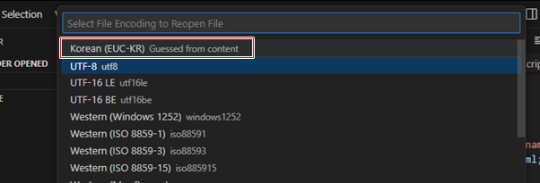 원래의 한글 인코딩을 찾기 위해서는 하단에 있는 인코딩 상태 값의 [UTF-8]을 클릭하면 상단 가운데에 다음처럼 [Reopen with Encoding] 메뉴를 볼 수 있습니다.