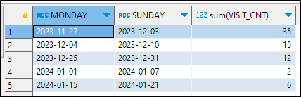각각의 데이터에 대한 주의 시작일과 종료일을 구했으니 다음은 그냥 월요일끼리 그룹으로 묶어주기만 하면 되겠죠