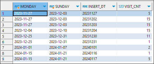 먼저 입력된 날짜(INSERT_DT)의 시작 주일(이번에는 한주의 시작을 월요일로)인 월요일과 주의 마지막 요일인 일요일의 날짜 컬럼을 추가해서 목록을 조회합니다.