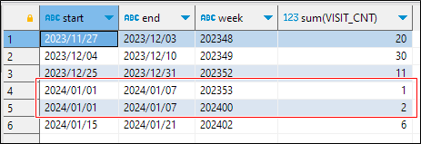 조회 결과에서 week 컬럼을 보면 년(year)+주번호(week number)로 잘 나와있지만 첫번째 컬럼의 start에는 날짜가 2023년을 넘어가면서 2023년의 마지막 주와 2024년의 첫번째 주의 시작이 같은 주에 맞물리게 되어 결과값이 중복되게 나오게 됩니다.