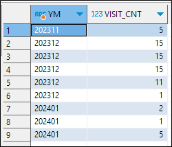 그리고 구해진 년월을 그룹으로 묶어주면 월별 통계를 구할 수 있습니다.