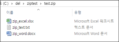 생성된 압축파일 test.zip을 열어보면 처음에 준비한 파일 3개파일이 압축되어 들어있는 것을 볼 수 있습니다.