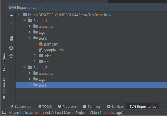 commit 완료 후 하단 SVN Repositories를 보면 Project 파일이 올라가 있는걸 볼 수 있습니다.