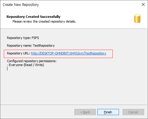 VisualSVN에서 Repository를 생성할 때 위치 접속 정보를 알려주는데 이 주소를 사용하면 됩니다.