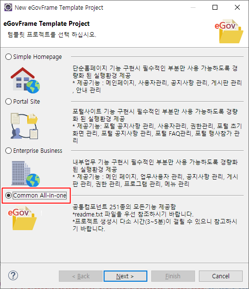 처음에 설명한것 처럼 전자정부프레임워크는 기본적으로 제공되는 프로젝트가 여러개 있는데 모든 내용이 들어있는 프로젝트인 all-in-one을 설치 합니다.