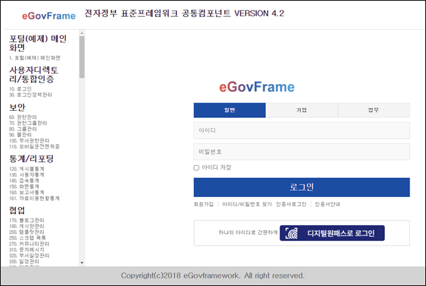 | 1. 홈페이지 템플릿(Simple Homepage) 로그인계정(관리자) : admin 로그인암호 : 1 2. 표준프레임워크 샘플포탈(Portal Site) 로그인계정(관리자) : admin , 로그인암호 : 1 로그인계정(사용자) : user1 , 로그인암호 : 1 3. 샘플 내부 업무사이트(Enterprise Business) 로그인계정(관리자) : admin , 로그인암호 : 1 로그인계정(사용자) : user1 , 로그인암호 : 1 4. 공통컴포넌트 (Common All-in-one) * 대소문자 유의 구분 : 일반사용자, ID : USER, PW : rhdxhd12 (영문으로 공통12) 구분 : 기업사용자, ID : ENTERPRISE, PW : rhdxhd12 (영문으로 공통12) 구분 : 업무사용자, ID : TEST1, PW : rhdxhd12 (영문으로 공통12) 구분 : 업무사용자, ID : webmaster, PW : rhdxhd12 (영문으로 공통12) |