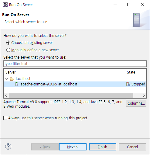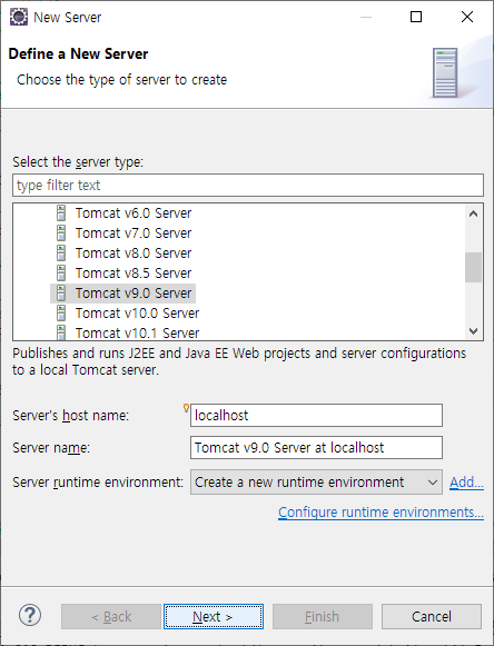 설치한 apache 9.0 서버가 보이는군요. 선택하고 [Next] 버튼을 클릭 합니다.