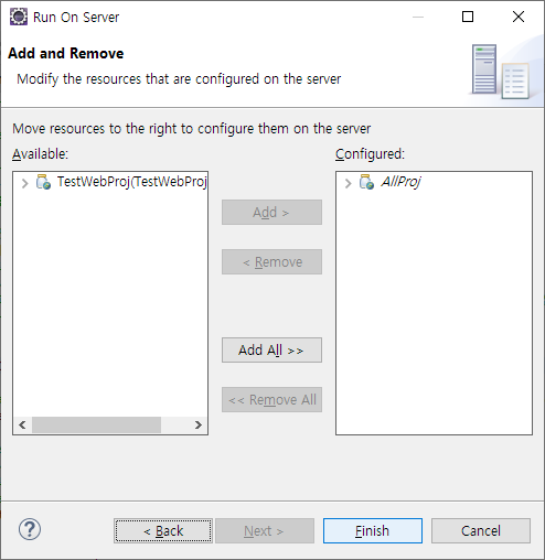 생성한 프로젝트가 우측에 들어있는지 확인하고 [Finish] 버튼을 클릭 합니다.