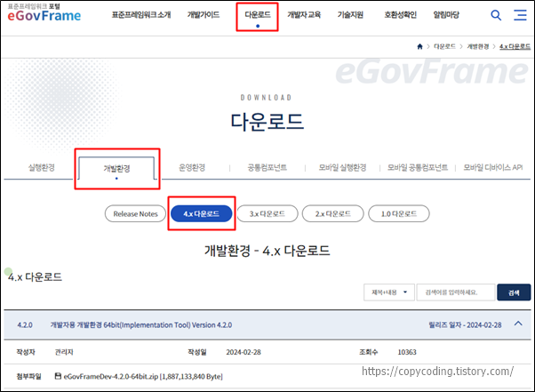상단의 [다운로드] 메뉴를 클릭하고 [개발환경] 탭을 선택 합니다. 설치할 버전을 선택 하게되면 목록이 나오는데 설치하려는 상세 버전을 클릭하여 첨부파일을 다운로드 받아 적당한 위치에 압축을 풀어주면 설치가 완료됩니다.